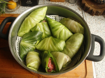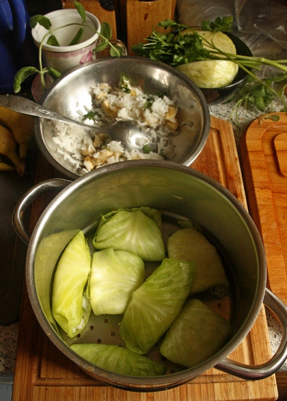 Ja poszłam jeszcze inną drogą. Główkę młodej kapusty obgotowałam tradycyjnie, a po zdjęciu z niej kolejnych warstw liści wypełniłam je aż dwoma rodzajami nadzienia. Jedne było mocno mięsne, bez domieszek, drugie – całkowicie bezmięsne, z ryżu. Oba rodzaje ugotowałam na parze, rzecz jasna oddzielnie.