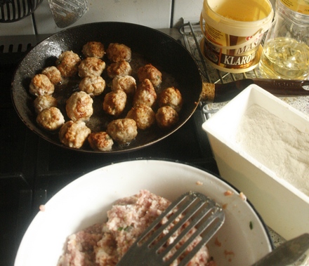 Na patelni rozgrzać olej, włożyć łyżkę masła klarowanego. Dłońmi obmywanymi zimną wodą formować okrągłe klopsiki, obtaczać w mące, a po strzepnięciu jej nadmiaru wrzucać na patelnię.