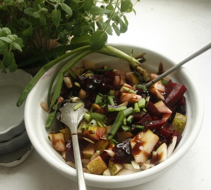 Buraki i gruszki pokroić w kostkę. W salaterce wymieszać z posiekaną dymką. Doprawić olejem, octem, solą i pieprzem. Posypać szczypiorem.