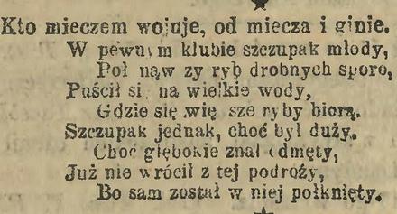 Uważam, że „Kurier Warszawski” był wtedy gazetą na wysokim poziomie. Gamę informacji, a też ich jakość i dzisiaj możemy podziwiać. Pisały w nim, często anonimowo, bo taki był obyczaj, prawdziwe talenty i indywidualności. Obok poważnych wieści miał także strony lżejsze. Z żarcikami i wierszykami. Niekiedy były jadowite, niekiedy zawierały aluzje dla nas mało już zrozumiałe, ale miały wymowę moralizatorską. Na przykład taki, o szczupaku, jest w zasadzie wierszowaną klasyczną bajką.
