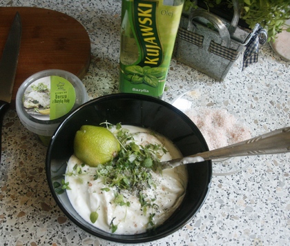 Na dressing czyli zimny sos wymieszałam jogurt z bazylią, dobrą łyżką oleju bazyliowego, świeżymi listkami tymianku, solą i sokiem z limonki do smaku.
