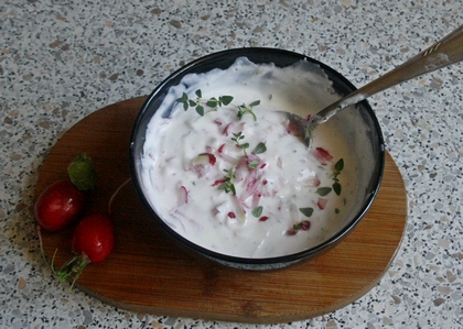 Inny smak, a także ciekawy różowy kolor, uzyskamy, gdy zamiast bazylii do tymianku dodamy szczypior i posiekane w kosteczkę rzodkiewki. Z oleju rezygnujmy lub dodajemy łyżeczkę słonecznikowego. Zamiast soku z limonki dodajemy sok z cytryny.
