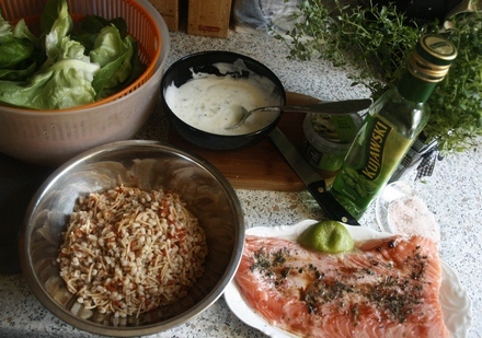 Do łososia z grilla, podawanego na ciepło, podajmy zimny dressing. Będzie pasował zarówno do ziemniaków (gotowane, obsmażone, pieczone), jak i do ugotowanej kaszy. Podałam kupioną w jednym z dyskontów (warto przepatrzyć jego półki z kaszami; są znakomite!), mieszankę kasz o składzie: orkisz, vermicelli (drobny makaron, czyli spolszczony wermiszel), pomidory.