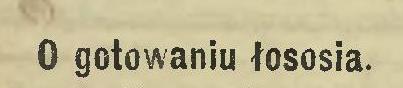 Podajemy tu parę uwag o gotowaniu tej ryby zaczerpniętych z angielskich pism, a Anglicy jak wiadomo celują w gotowaniu ryb morskich. Łosoś powinien być włożony odrazu [tak!] w gotującą wodę, do której na każdą kwartę dodaje się dwie łyżki stołowego najlepszego winnego octu, i dwie łyżeczki deserowe soli, niech się to wszystko dobrze zagotuje i dopiero wtedy włożyć rybę i gotować, rachując dziesięć minut czasu na każdy funt ryby. Jeżeli się włoży łososia w zimną wodę, cały smak z niego się wygotuje i mięso będzie niesmaczne, suche i bez koloru.