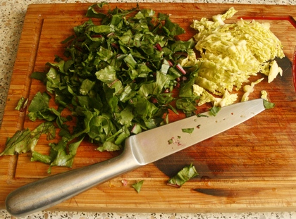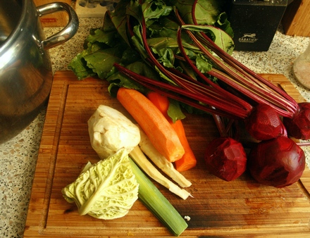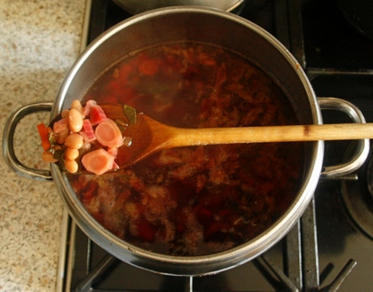 Bierzemy do niej botwinkę, czyli pęczek młodych buraczków razem z liśćmi. W polskiej kuchni z botwinki gotuje się zwykle chłodnik. Ale my pozostańmy przy zupie ciepłej. Przy tym – wyłącznie warzywnej. To właściwie barszcz. Rozmaite barszcze, do których bierze się botwinkę – wołyńskie, małorosyjskie, ukraińskie itd. – gotuje się na wędzonce. Z niej zrezygnowałam. Barszcz z botwinką gotowałam na samych warzywach. Białkowym dodatkiem była fasola. Botwinkę można podawać czystą lub zabielaną śmietaną. Oddzielnie podałam jednak coś białkowego, z mięsem. Były to uszka. Zwykle podaje się je do barszczu czystego. Spróbujcie jednak je dodać do botwinki. Zasmakują!