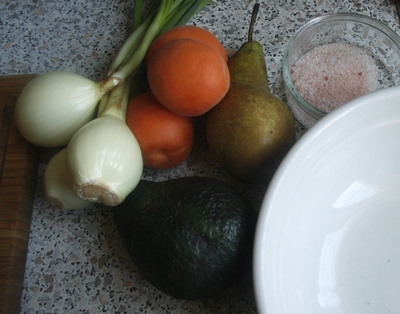 Awokado przekroić, wyjąć pestkę, miąższ pokroić w kostkę lub specjalną łyżeczką wydrążyć z niego kuleczki. Morele i gruszkę oczyścić, pokroić w kostkę (skórkę można zostawić). W zakręcanym słoiczku sporządzić winegret (proporcje klasyczne oliwy do octu – 1 : 3). Na dnie salaterki ułożyć awokado, skropić winegretem, następnie rozłożyć owoce. Przykryć krążkami cebuli i posiekanym szczypiorem. Polać resztą winegretu, przybrać listkami mięty.