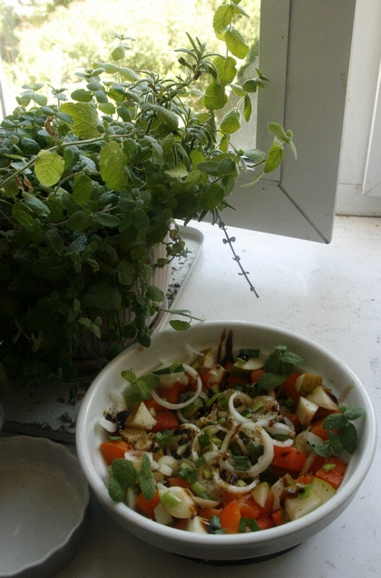 Owoce mieszamy już przy stole. Kto lubi mocniejsze wrażenia, może do nich wkroić papryczkę chili lub peperoni. Będzie pikantniej i jeszcze bardziej kolorowo. Sałatka nie tylko wygląda efektownie, ale smakuje bardzo, zwłaszcza do słodkawych żeberek.