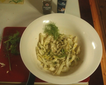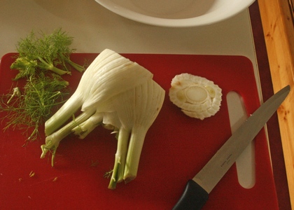 Autorka przepisu z „Asa” (bo chyba była to Zofia Szyc-Korska) podawała do swojego omletu zieloną sałatę. Do śniadania mi jednak nie pasowała. Zamiast niej przyrządziłam sałatkę z kopru włoskiego, czyli fenkułu. Bardzo lubię bulwy tego warzywa, mają lekko anyżkowy smak, który uważam za wytworny. Kto nie lubi anyżu, niech je omija! Część natki kopru o obłędnie świeżym odcieniu zieleni dodałam do omletu, część do cienko skrojonej bulwy.