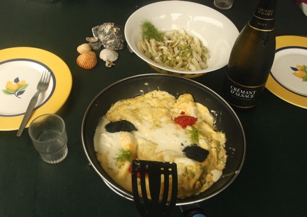 Właśnie takie wystawne i wręcz dekadenckie śniadanie jedliśmy ostatnio podczas naszych wakacji. Podałam je bez zadęcia, bo przecież byliśmy na campingu. Danie główne, warte pysznego alzackiego „cremanta” (Crémant d’Alsace), stanowił omlet. Nazwę go omletem z kawiorem, choć niektórzy uważają, że na ikrę ryb innych niż jesiotr nie powinno się tak mówić. Niech sobie kupią więc kawior prawdziwy!