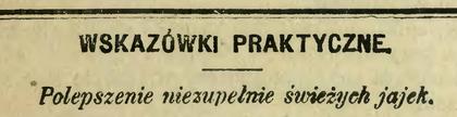 Przez wieki wielkim kłopotem gospodyń były jaja nieświeże. Pewnie, że jajka kur sprzed epoki chowu przemysłowego były smaczniejsze. Ale wobec braku chłodni, braku szybkiego transportu, leżały długo i stopniowo traciły świeżość. Nawet te częściowo nieświeże nabierały paskudnego smaku. Istniało więc wiele pomysłów i na to, aby świeżość zachować (np. trzymano je w wodzie wapiennej; takie jajka sprzedawano jeszcze w sklepach PRL-u), i na to, aby „przywrócić im świeżość”. Czy to było możliwe? Poczytajmy i oceńmy, ciesząc się, że od tych kłopotów jesteśmy uwolnieni. Sposób pochodzi z roku 1894 z nieocenionego „Kuriera Warszawskiego”. W tym czasie zamieszczał różne gospodarskie porady. Nie wiem, czy nie pisała ich Lucyna Ćwierczakiewiczowa, często wówczas i z sympatią w gazecie wymieniana.