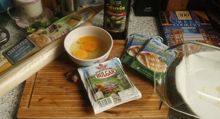 W sklepie przede wszystkim znajdziemy greckie sery: słoną i białą fetę (lub, jak zobaczymy, któryś z serów bałkańskich jej podobnych) i ser halloumi, czy inny, ale podobny do tego wyrobu pochodzącego z Cypru. Sery uczyniłam główną treścią naszego obiadu. Dodatkiem było ciasto, warzywa, przyprawy. No i oliwa. Akurat u mnie hiszpańska. Ale to niuans.