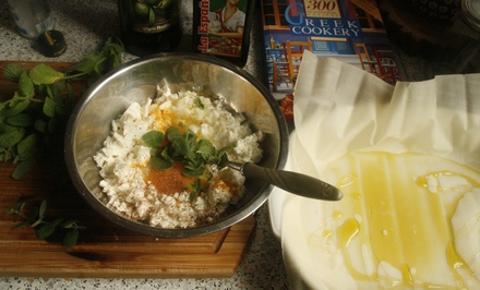 Ser feta rozkruszyć widelcem, twardy zetrzeć na tarce. Oba sery wymieszać z jajkami, posiekanymi listkami mięty, startą gałką muszkatołową i pieprzem z młynka. Farsz nie musi być idealnie gładki.