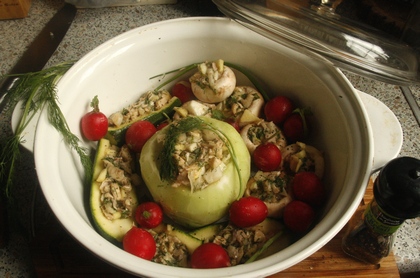 Przygotować nadzienie: gotowanego kurczaka przesiekać, wymieszać z tartą bułką, jajkami i sporą porcją przesiekanego koperku. Dodać przesiekane warzywa. Posolić, popieprzyć. Farszem wypełnić wydrążone warzywa. Obłożyć je kawałeczkami świeżego masła, podlać wodą (1/3–1/2 szklanki).
