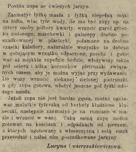 Dla porównania z moją zupą zamieszczę przepis z „Tygodnika Mód i Powieści” z roku 1889. Z pismem współpracowała już, po odejściu z „Bluszczu”, Lucyna Ćwierczakiewiczowa. Opisała postną zupę jarzynową. Ciekawe kluseczki opisane na końcu to węgierskie galuszki, na pewno smaczne, ale i… tuczące.