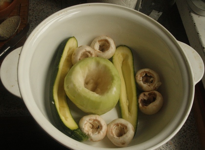 Warzywa umyć, obrać, kalarepę, cukinię i pieczarki wydrążyć. Rzodkiewki zostawić w całości. Wydrążone warzywa ułożyć w naczyniu żaroodpornym. Pozostałości po wydrążeniu przesiekać (jeżeli cukinie mają pestki, ich środki odrzucamy).