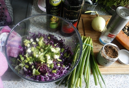 Kapustę zetrzeć na grubej tarce. Papaję zetrzeć lub pokroić w cienkie słupki albo płatki. Doprawić solą, cukrem jaggery, olejem i octem. Wyłożyć na dnie salaterki. Na kapuście rozsypać posiekany szczypior, ewentualnie z cebulą.