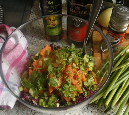 Na wierzchu sałatki umieścić pokrojoną papaję, doprawić tak jak kapustę, tyle że bez cukru lub z jego odrobiną. Obficie posypać posiekaną kolendrą i pieprzem z papryką. Do podania trzymać w lodówce.