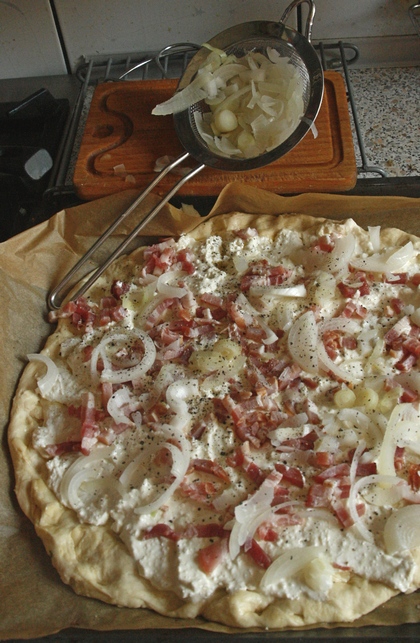 Wyrośnięte ciasto jeszcze raz wyrobić, rozwałkować lub rozciągnąć na blasze wyłożonej papierem do pieczenia. Palcami wgnieść dołki. Przygotować nadzienie: śmietanę widelcem wyrobić z twarogiem, posolić, popieprzyć. Cebulę pokroić w cienkie półplasterki, zblanszować (zanurzyć na chwilę w ciepłej wodzie), przestudzić. Boczek pokroić w paseczki lub w kostkę. Na cieście rozsmarować masę śmietanową.
