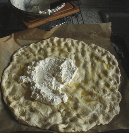 Przeczytawszy rozmaite przepisy opisujące wykonanie tego placka, przyrządziłam go trochę po swojemu. Chodziło mi o uzyskanie efektu zwartego, ale puszystego ciasta chlebowego, a nie cienkiego i kruchego. Dlatego ciasto drożdżowe wyrobiłam wcześniej i zostawiłam do wyrośnięcia. Oczywiście, na tę zabawę musiałam mieć czas.