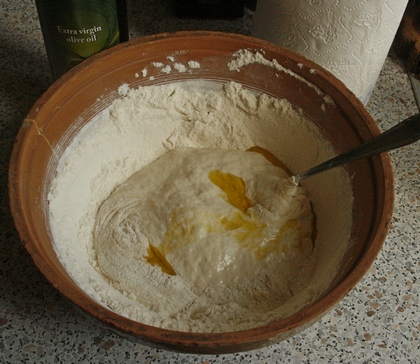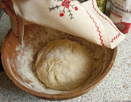 Ciasto najpierw może być rzadkie, lejące się, dodając stopniowo mąkę zagęszczamy je, aby stało się elastyczne, zwarte, ale miękkie. Wyrabiamy mieszadłami miksera albo ręcznie (ręce omączamy, aby ciasto się do nich nie kleiło). Formujemy z ciasta kulę, przykrywamy je, odstawiamy na kilka godzin (co najmniej na godzinę). Pod bardzo szczelnym przykryciem może stać nawet całą noc.
