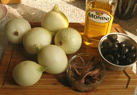 Cebule pokroić w cienkie półplasterki. Rozgrzać 4 łyżki oliwy, dolać oliwę spod anchois, wyłożyć cebule, doprawić solą (oszczędnie, bo anchois będą słone), pieprzem i tymiankiem. Jeżeli cebula nie jest naturalnie słodka, dodać łyżkę cukru pudru. Dusić ma małym ogniu pod przykryciem, mieszając od czasu do czasu. Cebula ma zmięknąć, ale nie może się przysmażyć.