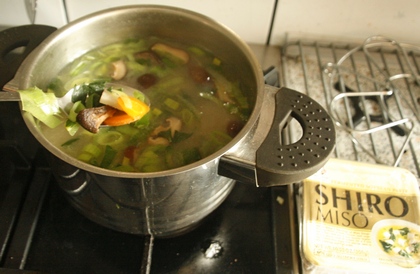 Warzywa oczyścić, pokroić w cienkie krążki. Posiekać nać selera. Grzyby namoczyć w letniej wodzie, gdy zmiękną – pokroić w plasterki. Zagotować wodę, wrzucić do niej warzywa (bez naci), pędy bambusa i grzyby, gotować 5 minut. Dołożyć pastę shiro miso do smaku, próbując, aby zupa nabrała smaku (2–4 łyżki). Gotować dalsze 5–10 minut. Warzywa nie powinny się rozgotować.