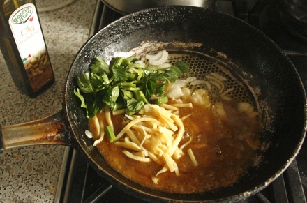 Olej rozgrzać, zeszklić w nim półplasterki cebuli i posiekany czosnek. Wlać gotowy sos, zamieszać, zagotować. Dorzucić pędy bambusa, posiekane liście bazylii i selera. Poddusić minutę.
