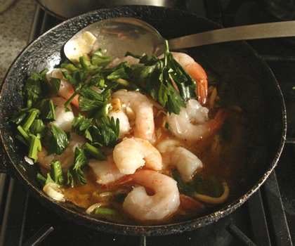 Do gorącego aromatycznego sosu dołożyć krewetki (mrożone rozmrozić, nawet niecałkowicie, byle dały się oczyścić). Dusić 4–5 minut, przemieszać.