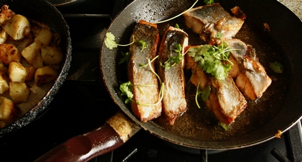 Na patelni rozgrzać oliwę, dodać łyżkę masła. Rybę wkładać skórą do dołu, smażyć aż zbrązowieje i zrobi się chrupka.