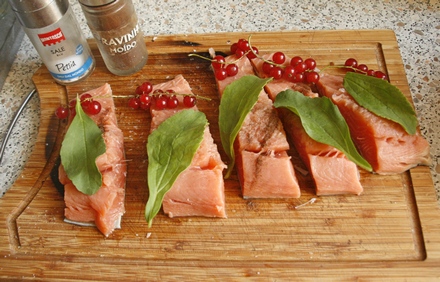 Rybę oczyścić i przygotować jak wyżej. Przyprawić solą i odrobiną mielonych goździków (nie za dużo, bo mają smak intensywny). Na każdy filecik położyć gałązkę porzeczek, przykryć ją liściem stewii, przymocować wykałaczką.