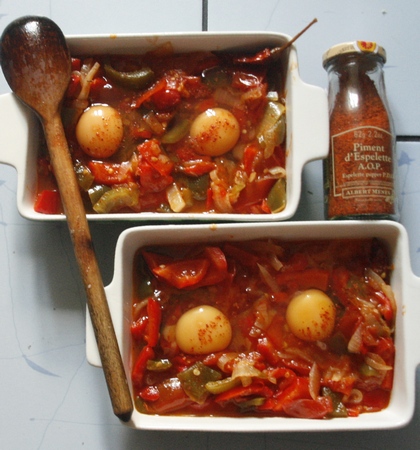 Bardzo podobne to danie do innego, które sporządziłam korzystając z francuskiej kuchni regionalnej. Tym razem pochodzi z regionu Pirenejów, z francuskiej Baskonii. To piperade. Duszona papryka, którą stylowo byłoby przygotować z tam uprawianej odmiany, od nazwy miejscowości nazwanej Espelette. Takiej rzecz jasna nie miałam, ale za to rodzimą paprykę – ileż jej rodzajów i kolorów znajdziemy na bazarze! – doprawiłam sypką papryką tej nazwy, którą przywiozłam z wakacji. Jest ognista w kolorze i smaku.