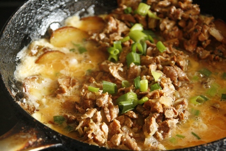 Po odwróceniu plasterków na drugą stronę zalać je jajkami rozkłóconymi z posiekanym szczypiorem, solą i pieprzem. Smażyć omlet jak zwykle, podważając, aby masa jajeczna spływała na spód.