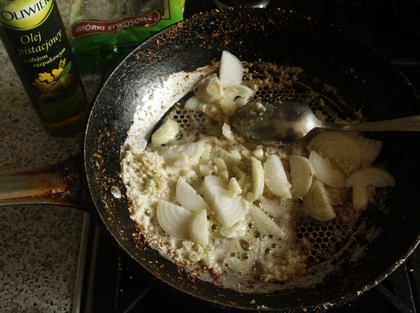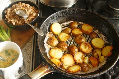 Na patelni z grubym dnem rozgrzać tłuszcz, podsmażyć w nim ziemniaki pokrojone w plasterki.