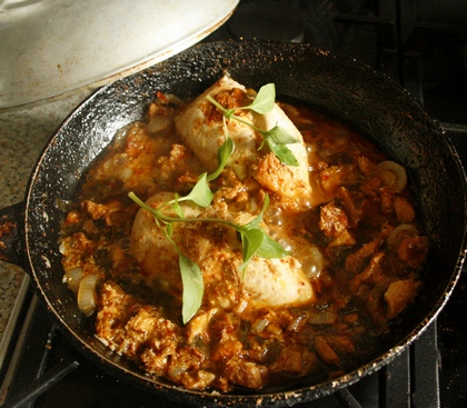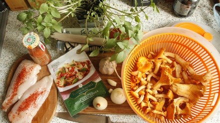Gdy cebula się zaszkli, dorzucić kurki. Smażyć aż z grzybków odparuje woda. Dodać sos bazyliowy. Na wierzchu położyć filety, przykryć. Dusić 20–30 minut.
