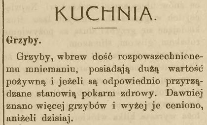 Że uważano je za jedne z przednich potraw „postnych”, tego dowodem, iż wśród siedmiu w Wigilję Bożego Narodzenia spożywanych potraw figurowały u przodków naszych nieodzownie suszone grzybki, pieczone lub podawane z kapustą kwaszoną, albo też jedne i drugie. Podziśdzień [!] coraz mniej ich widać na stołach, coraz mniej znachodzi się osób, umiejących zbierać sami grzyby, coraz więcej szerzą się uprzedzenia wobec pewnych rodzajów grzybków, podsycane wieściami o zdarzających się raz po raz otruciach.