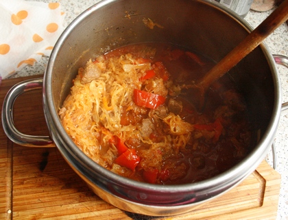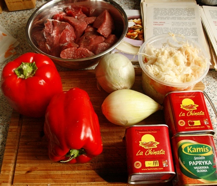Mięso pokroić w kostkę. Rozgrzać smalec, wrzucić pokrojoną cebulę, posypać słodką papryką mieloną, wrzucić mięso i kminek (1/2 łyżeczki lub cała), obsmażyć. Dusić je we własnym sosie. Co jakiś czas mieszać. Po kwadransie dodać pokrojoną w paski słodką paprykę. Po kolejnym, gdy mięso mięknie, dodać kapustę kiszoną, podlać tyle wody, aby prawie wszystko przykryła. Doprawić papryką wędzoną: słodką i ostrą. Posolić po sprawdzeniu, czy nie wystarczy dodanie kapusty.