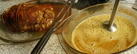 Spróbować, ewentualnie doprawić. Jeżeli sos jest za rzadki, odparować go na ogniu. Plastry mięsa można podać od razu, a sos oddzielnie lub mięso odgrzewać w sosie i razem z nim podać na stół.