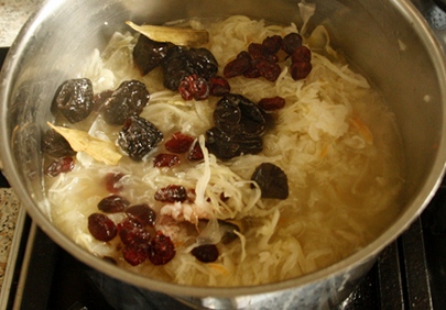 Do tej pieczeni podałam kapustę kiszoną. Teraz można dostać naprawdę dobrą. Świeżą, nie za kwaśną, delikatną. Ugotowałam ją jak zwykle (do obiadu wytwornego podlejmy ją białym winem, po alzacku), zaprawiłam małą cebulką uduszoną w gęsim smalcu, zasmażoną z płaską łyżką mąki. Do aromatycznej zawartości garnka duszącej się z listkiem laurowym i zielem angielskim oraz pieprzem i jałowcem dorzuciłam garść suszonych śliwek i żurawin. Śliwki lepiej oczyścić z pestek, można je także pokroić w paseczki. Ale takie w całości mają wiele smacznego uroku.