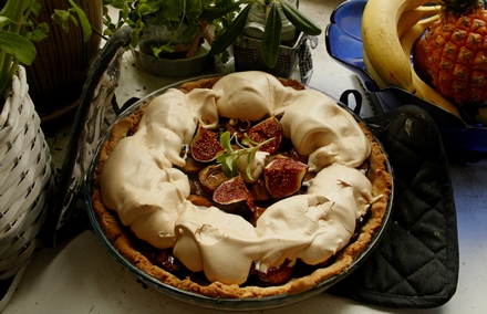 Białka ubić na sztywną pianę z dodatkiem 4 łyżek cukru pudru zwykłego lub ze stewii. Na podpieczone ciasto wyłożyć figi oraz pianę z białek.