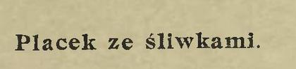 Rozczynić pół kwarty mąki kwaterką mleka ciepłego, rozrobić żeby krupek nie było, i wlać 4 łuty drożdży [łut to niecałe 13 g] rozpuszczonych w łyżce mleka – zostawić do podrośnięcia – dodać 4 żółtka, 2 łyżki masła, 1/4 cukru – gdy się ruszy, rozciągnąć na blasze masłem posmarowanej, śliwki dojrzałe na połówki poprzerzynane, pestki wyjąwszy ułożyć na placku skórkami do ciasta – niech podrośnie ciasto – śliwki pocukrować – placek wstawić do gorącego pieca na pół godziny – po wyjęciu z pieca jeszcze raz pocukrować.