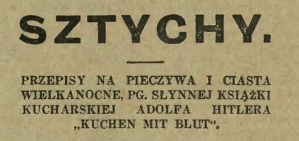 Drobno siekanych mak-donaldóiw 10 deka, mussolinich 10 deka, ruzweltów 10 deka, oliwek lokareńskich 5 deka, proszku patentowanego Stresemanna uncja – zagnieść, postawić w łagodnem cieple, potem rozwałkować na kolumny i szpalty, i drukować tasiemcami w kraju i zagranicą, dobrze smarując. – Krew zacierać starannie.