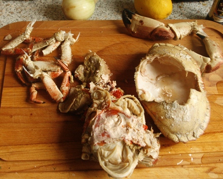 … przygotowałam trzy dania. Krab – irlandzki (tourteau), wstępnie obgotowany – kosztował mnie 10 zł. Dodatki pewnie drugie tyle. A więc za 20 złotych można mieć obfity obiad (albo obiad z kolacją) i wiele zabawy. Głównie z czyszczeniem kraba, czyli wydobywaniem z niego mięsa. A są w nim dwa jego rodzaje: białe i ciemne. Jak je wydobyć?