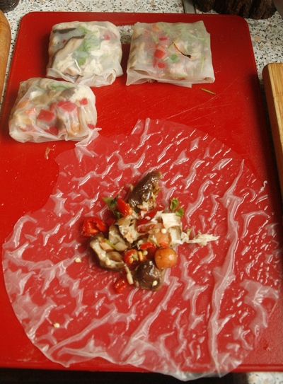 Do potrawy numer dwa będą potrzebne naleśniki ryżowe. Przed przyrządzeniem, aby zmiękły, każdy trzeba namoczyć w letniej wodzie. Całkiem miękkie ostrożnie wyjąć i wyłożyć na wilgotną deseczkę. Nakładać farsz, ostrożnie zwijać, aby nie pękły (farszu nie może być za dużo).