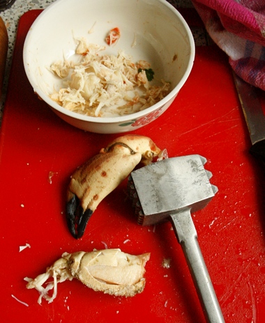 W miseczce drugiej składamy mięso białe. Wyjmujemy je głównie ze szczypiec kraba. Te większe miażdżymy młotkiem lub tłuczkiem do mięsa. Ze szczypiec mniejszych wyjmujemy je za pomocą jakiegoś szpikulca, np. szpadki do szaszłyków. I już. Można działać dalej.