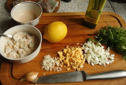 Wymieszać składniki sosu majonezowego, proporcje dobrać do swego smaku. Na końcu wmieszać do niego łyżkę lub łyżeczkę alkoholu i sok z cytryny. Oczyszczoną, obmytą i osuszoną skorupę kraba nasmarować olejem cytrynowym. Mięso kraba przesiekać. Jajko rozdzielić na białko i żółtko. Posiekać je. Kolendrą pokroić.