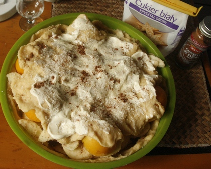 Wierzch posmarować śmietaną, posypać cukrem i cynamonem. Nakłuć lekko widelcem (zwłaszcza jeżeli ciasto jest równo i elegancko rozłożone).