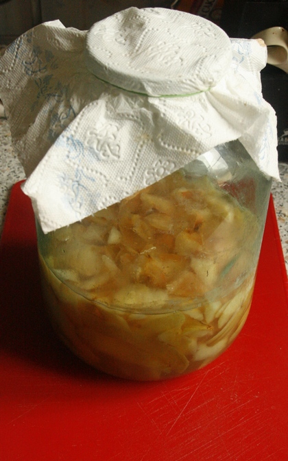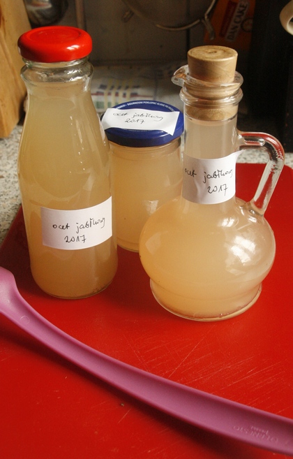 Urocza dydaktyka, prawda? Tak wtedy zwracano się „do ludu”. Ale ocet udał się znakomicie. Obierki i ogryzki z jabłek zalałam wodą, dodałam łyżeczkę cukru, przykryłam papierowym ręcznikiem kuchennym i odstawiłam w ciepły kąt przy grzejniku. Co jakiś czas mieszałam, aby łupinki były zanurzone (czyniłam to nieregularnie, bo… zapominałam). Żadnej pleśni nie stwierdziłam. Po ok. dwóch tygodniach ocet zlałam. Pewnie można go przefiltrować. Jest kwaskowy i bardzo smaczny.