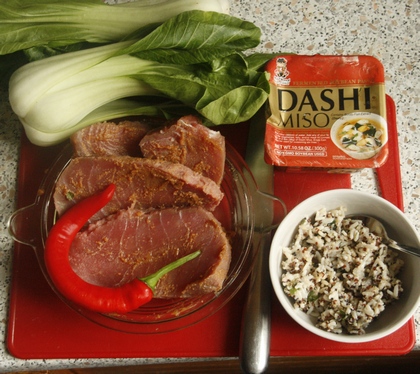 Zanim się za nią zabrałam, doprawiłam rybę. Był nią tuńczyk. Lubimy steki z niego. Do niedawna były bardzo drogie, dzisiaj, za sprawą jednego z dyskontów, kupuję go w cenie… dorsza. No, prawie. Oczywiście, szukamy takiej ryby, która pochodzi z połowów zrównoważonych, czyli podlegających kontroli. Sposób na tuńczyka jest tak prosty, że aż banalny. Do jego przyprawienia użyłam japońskiej pasty dashi miso. Wiem, wiem, służy głównie do ugotowania zupy miso. Ale ja potraktowałam nią naszą rybę. Pasta pogłębiła smak płatów tuńczyka. Nie trzeba go już solić. A po krótkim zgrillowaniu – zrobiłam to na patelni grillowej, ale kto ma grill na powietrzu, niech go użyje – nie wyschnie.