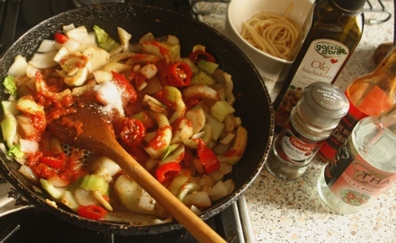 Warzywa doprawić sosem sojowym, przecierem pomidorowym, octem ryżowym, pieprzem z papryką i cukrem. Spróbować, aby osiągnąć wyraźny smak słodko-kwaśny. Na końcu dorzucić pokrojone liście kapusty. Smażyć jeszcze minutę.