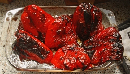 Strąki papryki przekroić na pół, oczyścić z pestek i błonek. Ułożyć skórką do góry w naczyniu żaroodpornym wyłożonym folią aluminiową lub papierem do pieczenia, co zapobiegnie pobrudzeniu naczynia. Wstawić pod opiekacz piekarnika nagrzanego do 200–220 st. C na 5– 8 minut. Opiekać, aż skórka zrobi się czarna. Sprawdzić czy opiekła się cała skórka. Ewentualnie ułożyć nieopieczoną skórką do góry i dopiec.